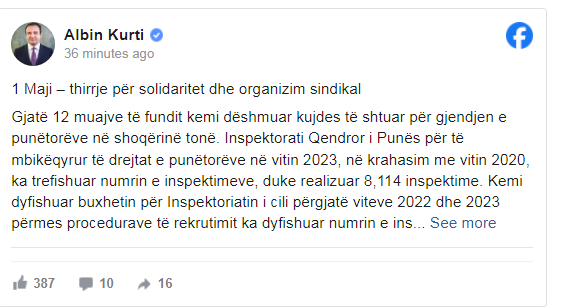 Kryeministri i Kosovës, Albin Kurti, ka shkruar në Facebook për 1 Majin, Ditën Ndërkombëtare për të Drejtat e Punëtorëve.