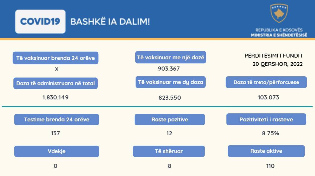 Ministria e Shëndetësisë, sipas të dhënave nga Instituti Kombëtar i Shëndetësisë Publike të Kosovës, informon se brenda 24 orëve në vendin tonë janë shënuar 12 raste pozitive me covid-19.
