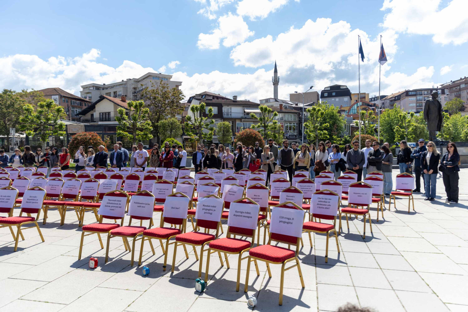 120 karrige të zbrazëta janë vendosur përballë hyrjes së Kuvendit – një për secilin deputet që, për më shumë se tre muaj, ka dështuar të përmbushë detyrimin më bazik të mandatit të tij, atë të përfaqësimit të qytetarëve përmes një Kuvendi funksional, përfaqësues dhe llogaridhënës. Karriget përfaqësojnë po ashtu boshllëkun institucional, mungesën e vullnetit politik dhe krizën e përfaqësimit që po e paralizon shtetin.