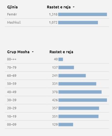 351 të infektuar janë të moshës 10-19 vjeç, ndërsa 357 të moshës 20=29 vjeç.