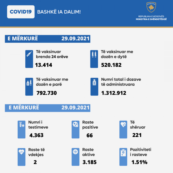 “Në 24 orët e fundit janë dhënë 13.414 doza të vaksinës kundër COVID-19. Prej fillimit të vaksinimit në të gjitha qytetet e Kosovës janë dhënë 1.312.912 doza të vaksinës. Deri më sot 520.182 qytetarë janë vaksinuar me dozën e dytë”, është thënë nga Ministria e Shëndetësisë.