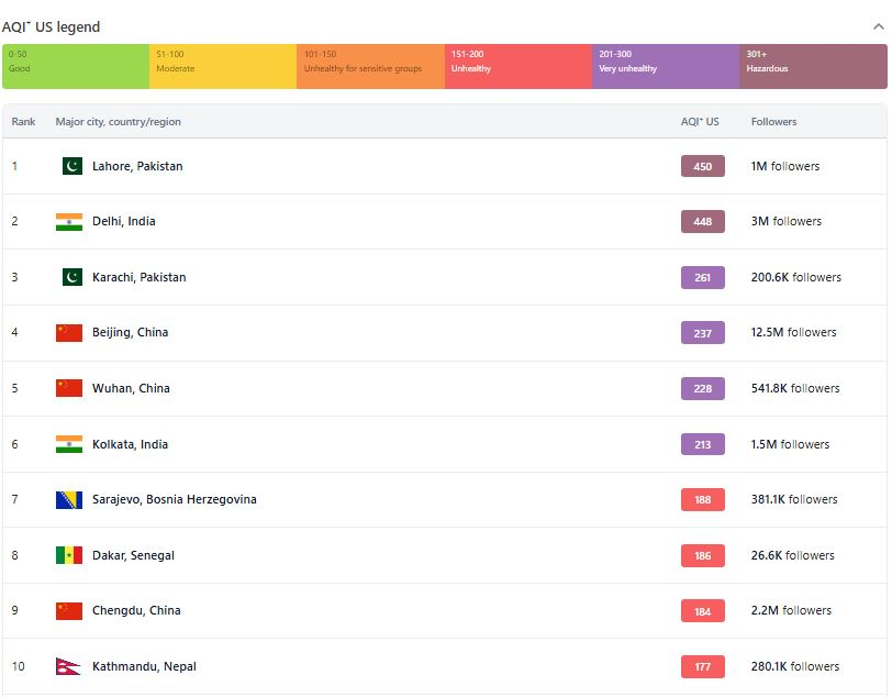 Kurse vendin e parë për nga cilësia me e dobët e ajrit, sonte e zë kryeqyteti i Pakistanit, Lahore, ku niveli i grimcave të dëmshme PM është 450.