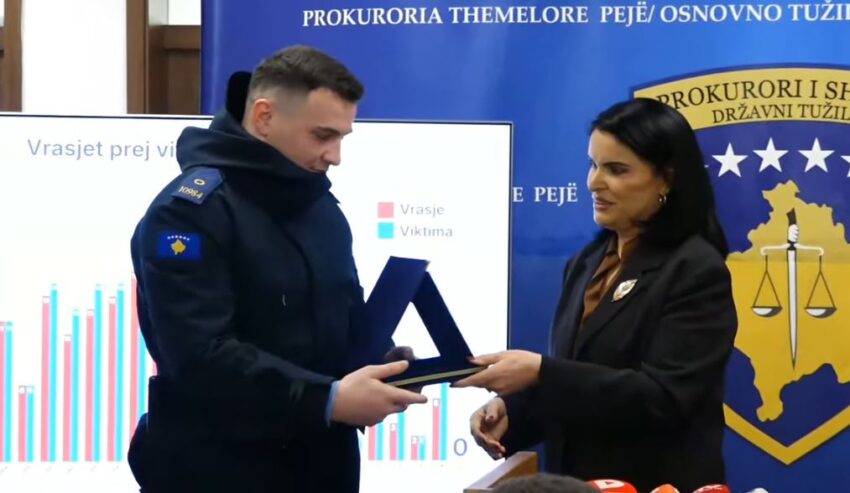 Tre zyrtarë policorë, Labinot Shala, Bislim Kelmendi dhe Fisnik Bytyqi janë nderuar me mirënjohje nga Prokuroria Themelore e Pejës, për siç tha Kryeprokurorja e Pejës, Lumturije Vuçetaj, për heroizmin dhe profesionalizmin që rajoni i Pejës në 2025-tën mos të shënojë asnjë vrasje, raporton Ekonomai Online