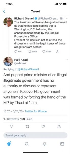 Grenell kishte thënë se pavarësisht kësaj, takimi i 27 qershorit në Washington do të mbahet dhe se në të do të marrë pjesë kryeministri Hoti.