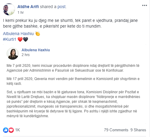 Aktivisti i njohur Atdhe Arifi ka thënë pasi shpërndau postimin e ministres në detyrë se “I kemi prekur ku ju djeg më së shumti, tek paret e vjedhura, prandaj janë bërë gjithë bashkë, e pikërisht për këtë do t’i mundim.”