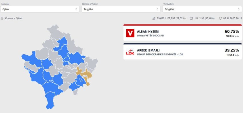 Kandidati i Lëvizjes Vetëvendosje për kryetar të Komunës së Gjilanit, Alban Hyseni është duke dominuar bindshëm ndaj kundërkandidati të tij nga radhët e LDK-së, Arbër Ismajli.