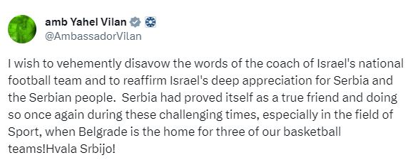 “Dua t’i mohoj me forcë deklarimet e trajnerit të ekipit kombëtar të futbollit dhe të riafirmoj vlerësimin e thellë të Izraelit për Serbinë dhe popullin serb. Serbia e kishte dëshmuar veten si mike e vërtetë dhe e bëri këtë edhe një herë në këto kohë sfiduese, veçanërisht në fushën e sportit, kur Beogradi është shtëpi e tri skuadrave tona të basketbollit”, shkroi diplomati izraelit.