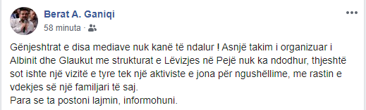 “Asnjë takim i organizuar i Albinit dhe Glaukut me strukturat e Lëvizjes në Pejë nuk ka ndodhur, thjeshtë sot ishte një vizitë e tyre tek një aktiviste e jona për ngushëllime, me rastin e vdekjes së një familjari të saj”, ka shkruar Graniqi në Facebook.