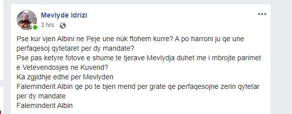 “Pse kur vjen Albini ne Peje une nuk ftohem kurre? A po harroni ju qe une perfaqesoj qytetaret per dy mandate? Pse pas ketyre fotove e shume te tjerave Mevlydja duhet me i mbrojte parimet e Vetevendosjes ne Kuvend? Ka zgjidhje edhe per Mevlyden. Faleminderit Albin qe po te bjen mend per grate qe perfaqesojne zerin qytetar per dy mandate/ Faleminderit Albin”, ka shkruar ajo.