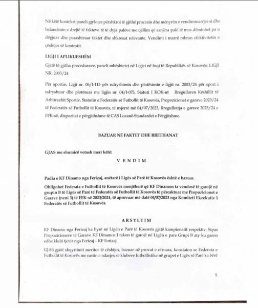 Këshilli i Arbitrazhit sportiv e ka hedhur poshtë vendimin e Federatës së Futbollit të Kosovës për ta zhvendosur klubin e futbollit Dinamo nga Ferizaj prej Grupit B në Grupin A të Ligës së Parë.