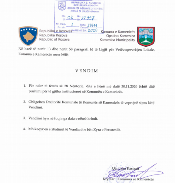 “Kryetari Qëndron Kastrati ka marr vendim që dita e hënë (30 nëntor 2020), do të jetë ditë pushimi në të gjitha institucionet e Kamenicës. Ky vendim vjen për nder të festës së 28 Nëntorit”, thuhet në njoftim.