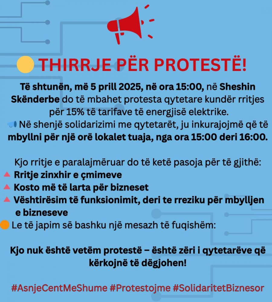 Të shtunën, më 5 prill 2025, në Prishtinë do të mbahet një protestë kundër rritjes së çmimit të energjisë elektrike, e cila pritet të ketë një ndikim të rëndë për qytetarët dhe bizneset. Aktivistët dhe qytetarët do të mblidhen në sheshin “Skënderbe”, duke filluar nga ora 15:00, për të shprehur kundërshtimin ndaj rritjes prej 15% të tarifave të energjisë elektrike.