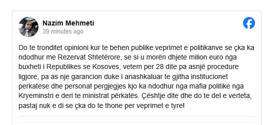 “Do te tronditet opinioni kur te behen publike veprimet e politikanve se çka ka ndodhur me Rezervat Shtetërore, se si u morën dhjete milion euro nga buxheti i Republikes se Kosoves, vetem per 28 dite pa asnjë procedure ligjore, pa as nje garancion duke i anashkaluar te gjitha institucionet perkatese dhe personat pergjegjes kjo ka ndodhur nga mafia politike nga Kryeminstri e deri te ministrat përkatës. Çështje dite dhe do te del e verteta, pastaj nuk e di se çka do te thone per veprimet e tyre” – ka shkruar ai.