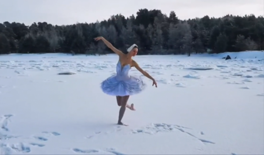Një balerinë ruse nga Teatri Mariinsky e veshur me kostum ka interpretuar skena nga “Liqeni i Mjellmave” së Çajkovskit. Këtë e ka bërë jo në skenën të teatrit por në gjirin e ngrirë të Finlandës.