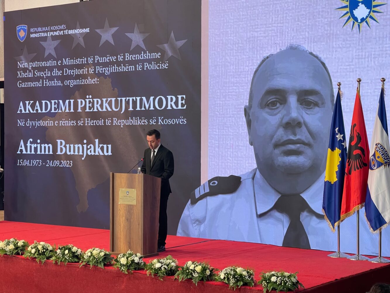 “Sot nderojmë heroizmin e një prej bijve më të devotshëm të republikës sonë, heroit tonë Afrim Bunajku. Me veprën e tij sublime ai u bë dëshmi dhe garanci e sovranitetit dhe integritetit territorial të Kosovës. Bashkë me kolegët e tij policë, dy vite më parë e në vazhdimësi u dëshmua se mbrojtja e republikës përveç detyrë profesionale, është përkushtim e betim për mbrojtjen e bazamenteve të kushtetutës sonë që Kosova të mbetet gjithmonë shtet i pavarur, sovran, unik dhe i pandashëm. Akti terrorist i dy viteve më parë që i mori jetën rreshterit Bunajku ishte i sponsorizuar, i financuar dhe i realizuar nga vetë shteti serb. Pasi falë heroizmit e atdhedashurisë së policëve tanë që mbrojtën territorin duke ia dështuar planin Serbisë, ajo u bë strehë për ekzekutuesit e këtij akti, duke dëshmuar që vazhdon të mbajë gjallë politikën destabilizuese dhe armiqësore ndaj shtetit tonë”, tha ai.
