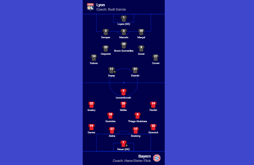 Leëandoëski, Gnabry, Muller dhe Perisic pritet që t’i prijnë sulmit bavarez, kurse nga Lyoni në sulm është Depay dhe Ekambi.