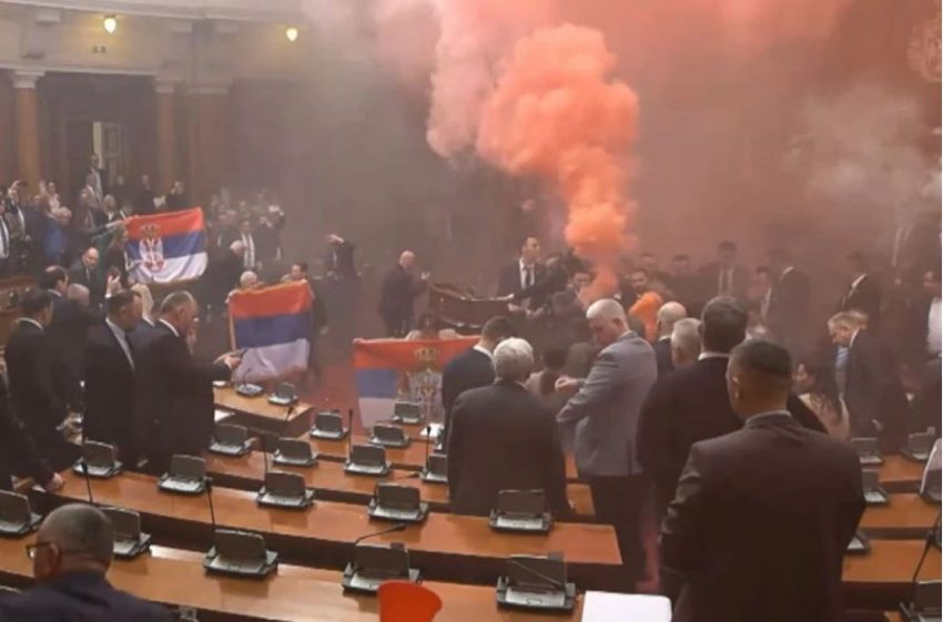 Kryetarja e Kuvendit të Serbisë, Ana Bërnabiq u bëri thirrje deputetëve që të vazhdojnë punën pasi deputetët e opozitës hodhën gaz lotsjellës në sallën e parlamentit.