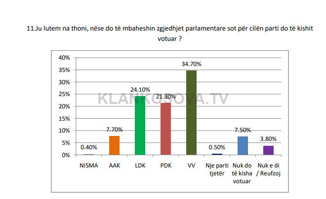 Më pas vjen LDK-ja me 24.10%, PDK-ja me 21.3%, AAK me 7.70%, ndërsa 7.50% nuk do të kishin votuar.
