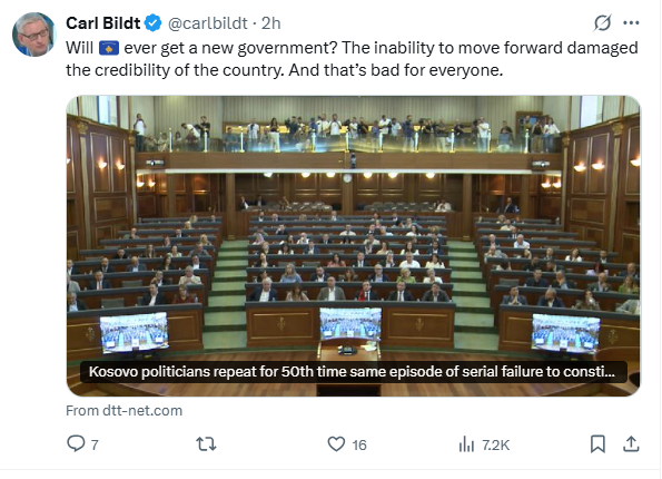 50 seancat e dështuara konstituive në Kosovë kanë tërhequr vëmendjen e ish-kryeministrit të Suedisë, Carl Bildt.