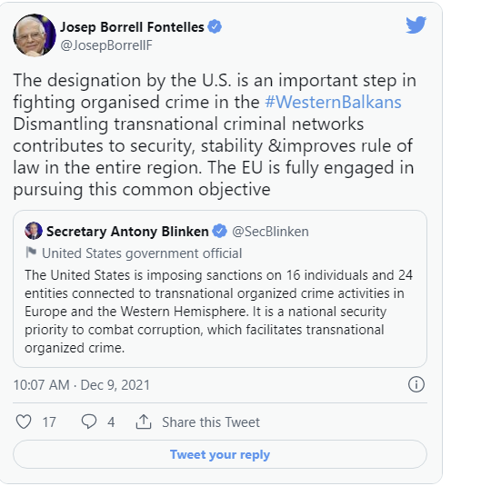 Përfaqësuesi i Lartë i Bashkimit Evropian, Josep Borrell, ka thënë se i mirëpret sanksionet e disa serbëve nga Kosova, e të cilat sipas Amerikës, janë pjesë e një grupi të krimit të organizuar.