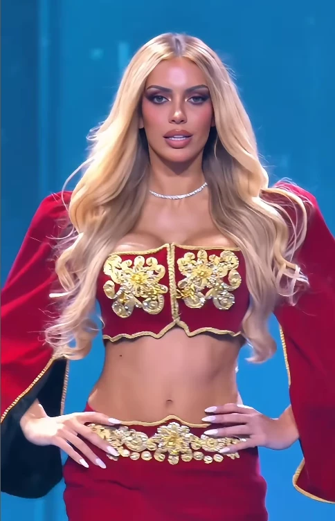 Së fundmi, Brikena u shfaq me një veshje tradicionale shqiptare, por e risjellë në një version modern dhe të guximshëm, në ngjyrë të kuqe, që simbolizon energjinë, pasionin dhe krenarinë kombëtare.