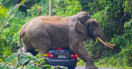 Elefanti gjigant vendos të ulet sipër veturës me udhëtarë