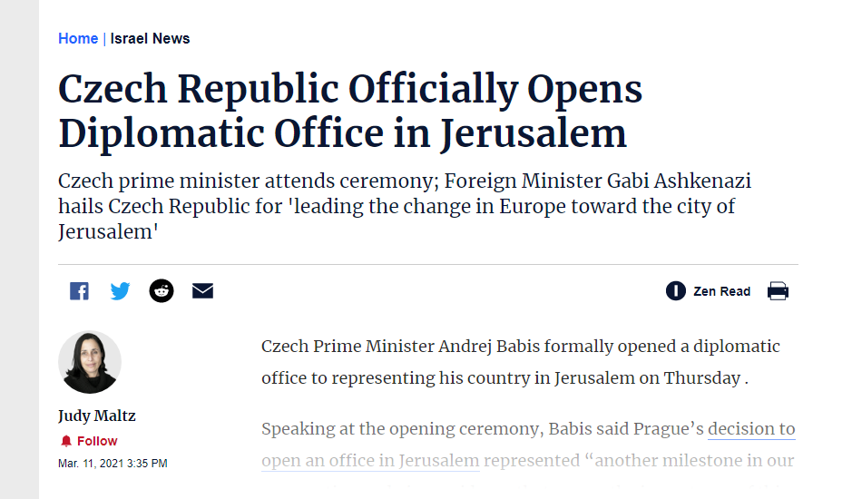 Gazeta më e madhe izraelite “Haaretz” ka raportuar sot për vendimin e Republikës së Çekisë për hapjen e Zyrës Diplomatike në Jerusalem.