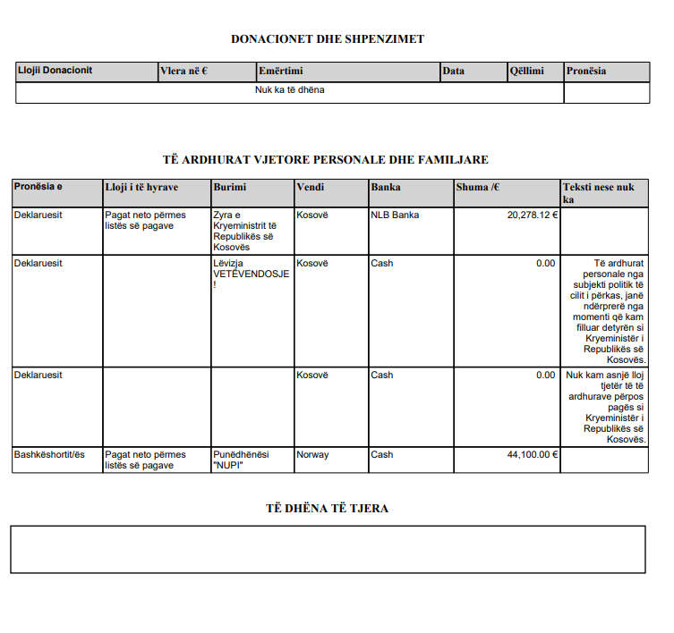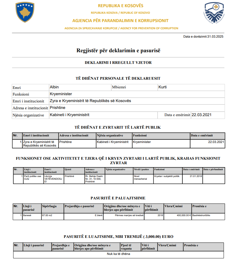 Kryeministri në detyrë, Albin Kurti, ka bërë deklarimin vjetor të pasurisë pranë Agjencisë kundër Korrupsionit. Nga deklarimi i dorëzuar në mars, del se bashkëshortja e tij ka dyfish më shumë të hyra vjetore sesa ai.