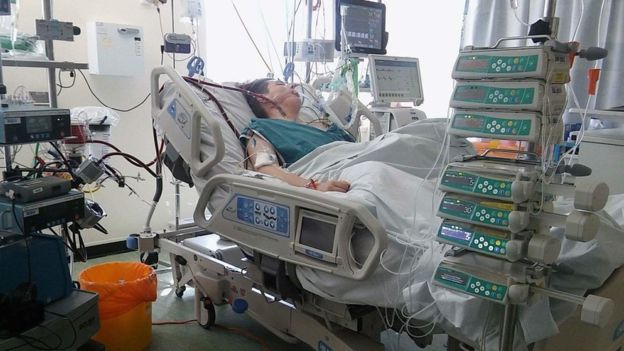 Ai u dërgua në Leicester dhe iu bashkangjit një makine artificiale të mushkërive ose ECMO (oksigjenimi i membranës jashtë-korporeale).