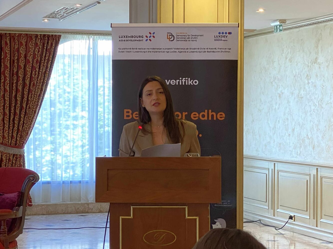 “Në ditët e sotme, informacioni hapet me shpejtësinë e një klikimi. Analiza dhe filtrimi që duhet bërë informatave të tilla po zhvillohet paralelisht me të nxënit e mësimit në klasat e para. Pikërisht për këtë arsye kemi vendosur që të lansojmë sot platformën ‘Verifiko.info’, i cili është një mjet digjital i krijuar për nxënësit dhe mësimdhënësit e shkollave të mesme për të forcuar shkathtësitë për edukim medial dhe mendim kritik”, tha ajo.