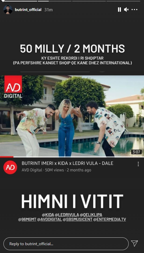 “50 milionë, dy muaj. Ky është rekordi i ri shqiptar (pa përfshirë këngët shqip që kanë ndez internacional). Himni i vitit”.