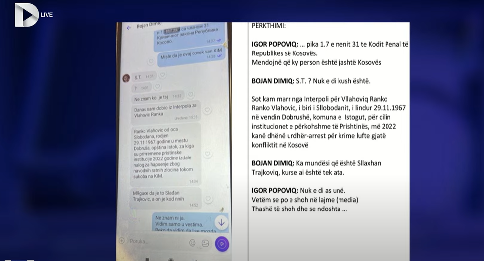 Në një tjetër komunikim, Popoviq flet për Ranko Vllahoviqin, i cili ndodhet në listën e të kërkuarve nga Kosova për krime lufte.