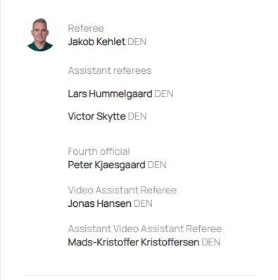 Jakob Kehlet do të jetë gjyqtari kryesor. Lars Hummelgaard dhe Victor Skytte do të jenë ndihmësit e tij.