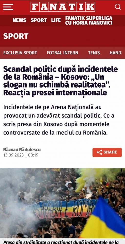 Mbrëmë, në ndeshjen kualifikuese në mes të Rumanisë dhe Kosovës në Bukurresht, tifozët vendas shpalosën një sllogan “Kosova është Serbi”.