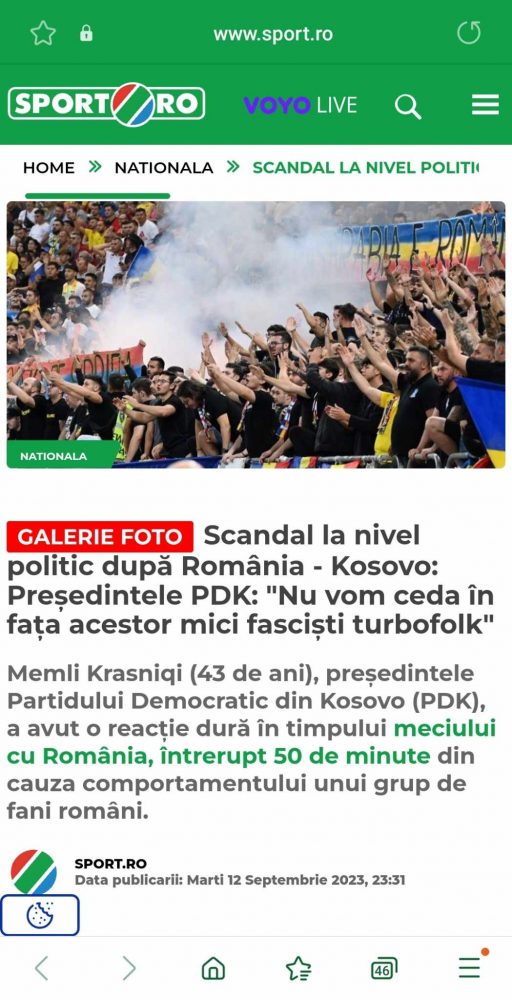 “Kemi punuar shumë për këtë ditë dhe nuk dorëzohemi para fashistëve të vegjël turbofolk. E përjetshme është Kosova!”, ka përfunduar shkrimin e tij lideri i opozitës kosovare. Nëpër mediat rumune, deklaratat e Krasniqit kanë zënë ballinat e mediumeve sportive dhe jo vetëm, duke e quajtur organizimin e dobët të ndeshjes në Rumani dhe slloganet fashiste edhe si “Skandale Diplomatike”.