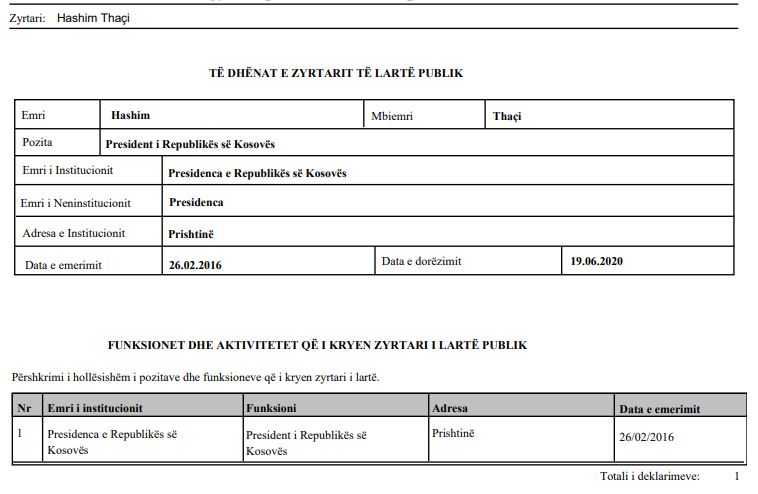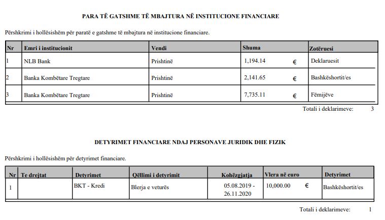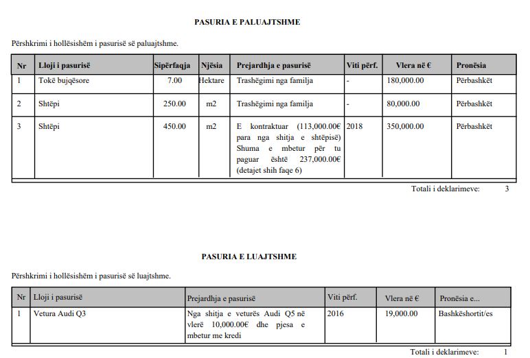 “Pagesa e shtëpisë ende nuk është bërë, për shkak të mos arritjes së marrëveshjes rreth kredisë. Afati i pagesës për shtëpi është shtyer deri më 30.11.2020”, thuhet në regjistrin për deklarimin e pasurisë të publikuar nga Agjencia Kundër Korrupsionit.