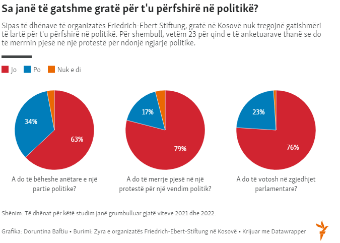 Por, një studim i vitit 2022 nga Zyra e organizatës Friedrich-Ebert-Stiftung në Kosovë tregonte se 76 për qind e grave të përfshira në mostër, nuk do të votonin.