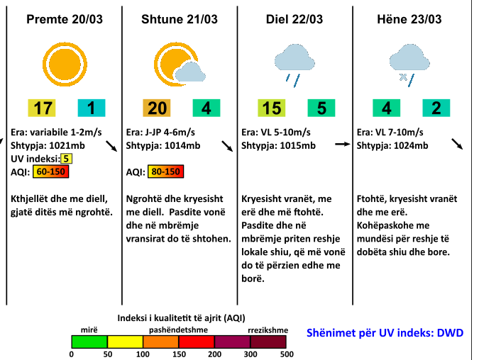 22.03-23.03 – Ditën e diel kryesisht vranët, me erë dhe më ftohtë. Pasdite dhe në mbrëmje priten reshje lokale shiu, që më vonë do të përzien edhe me borë. Ditën e hënë ftohtë, kryesisht vranët. Kohë pas kohe me mundësi për reshje të dobëta shiu dhe bore.