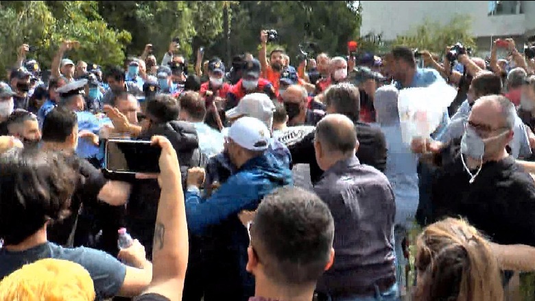 Protestuesit me thirrjet ‘poshtë diktatura, poshtë Edi Rama, liri demokraci’ para godinës së ministrisë së Brendshme, ku është vendosur kordoni metalik.