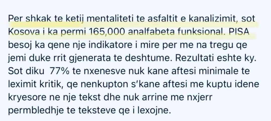 Testi PISA asht nji kriter matje e mësimnxanies dhe jo i mësimdhanies dhe sidomos jo tregues i analfabetizmit, që matet me kritere dhe ekspertë të UNESCO-s.