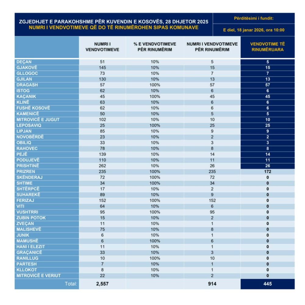 Sipas të dhënave, deri më tani procesi i rinumërimit është përmbyllur në 19 komuna, ndërkohë edhe gjatë ditës së sotme është duke vijuar rinumërimi i vendvotimeve që i takojnë komunës së Prizrenit dhe më pas, të tjera komuna, sipas radhës, do të përfshihen në këtë proces.