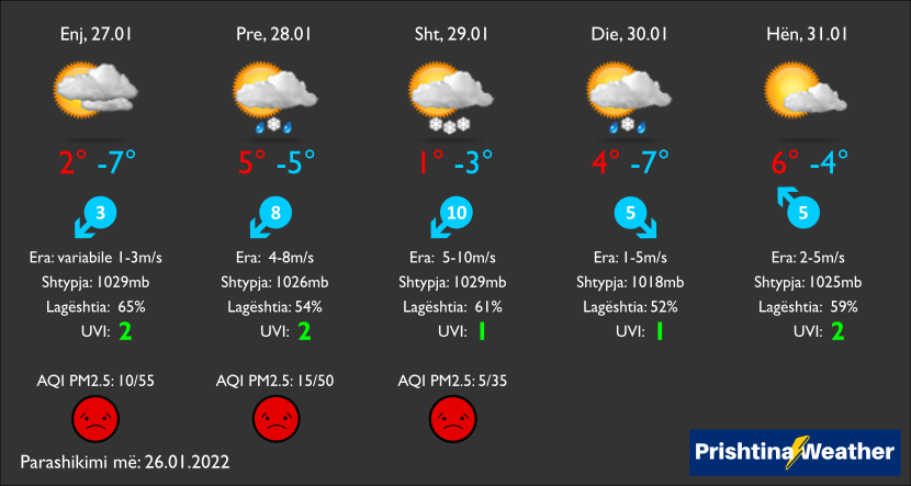 27.01 – Kryesisht me vransira dhe intervale me diell ditën. Mbetet ftohtë, me ngrica orëve të mëngjesit.