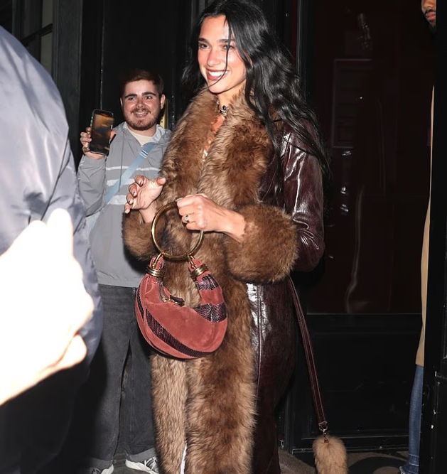 Dua ishte shumë elegante me fustanin midi prej mëndafshi rozë të çelët me vlerë 2 mijë paund, i cili kishte detaje dantelle, dhe e kombinoi atë me një pallto të gjatë lëkure që kushton 6 mijë paund.