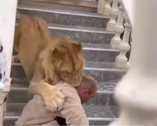 Një video e pazakontë është bërë virale kudo në rrjete sociale, e cila shfaq një luan duke kafshuar në qafë një burrë në oborrin e shtëpisë së tij.