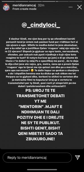 Përballja e tyre ishte e ashpër, mirëpo më e ashpër ka qenë pjesa që nuk është transmetuar në ekran. Opinionisti i “Për’puthen Prime”, Meridian Ramçaj, ka treguar nëpërmjet një story në llogarinë e tij në Instagram çfarë ka ndodhur vërtetë në përballjen e tyre.