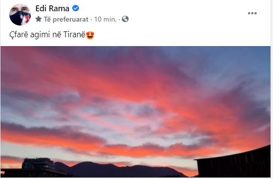 Rama ka publikuar një foto vetëm pak minuta më parë në rrjetet sociale, ku shfaqet qielli i Tiranës.