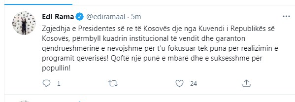 Zgjedhja e Presidentes së re të Kosovës dje nga Kuvendi i Republikës së Kosovës, përmbyll kuadrin institucional të vendit dhe garanton qëndrueshmërinë e nevojshme për t’u fokusuar tek puna për realizimin e programit qeverisës! Qoftë një punë e mbarë dhe e suksesshme për popullin!