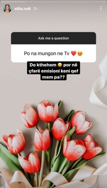 “Do kthehem. Por në çfarë emisioni keni qejf të më shikoni?”, është përgjigjur Elita duke pritur sugjerime nga ndjekësit.
