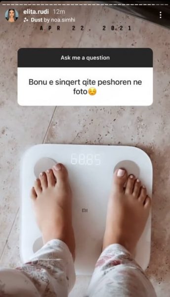 Elita ka treguar më herët se në shtatzëninë e dytë shtoi rreth 18 kilogramë dhe sot ka treguar se çfarë peshë ka arritur pas lindjes. Dikush nga ndjekësit e saj e ka pyetur sa peshon dhe të tjerë i kanë kërkuar që ta tregojë me fakt me një foto nga peshorja. Për të hequr dyshimet e të gjithëve, Elita ka ndarë në Instagram një foto të peshores, që shënon 68.85 kilogramë.
