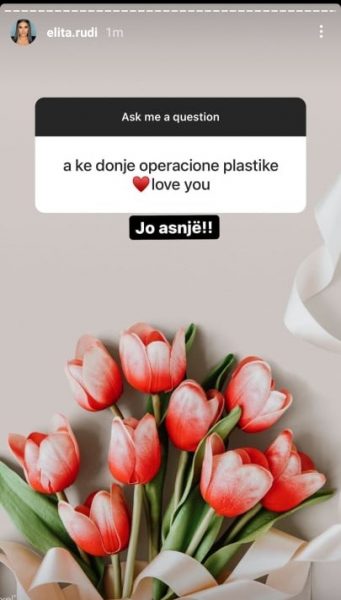 Nga ana tjetër ka pasur edhe nga ata që janë interesuar nëse Elita ka bërë ndonjë operacion plastik në fytyrë. Njëri nga ndjekësit është interesuar veçanërisht për buzët e moderatores. Ajo ka treguar se nuk bërë asnjë ndërhyrje në fytyrë dhe rrjedhimisht as në buzë.
